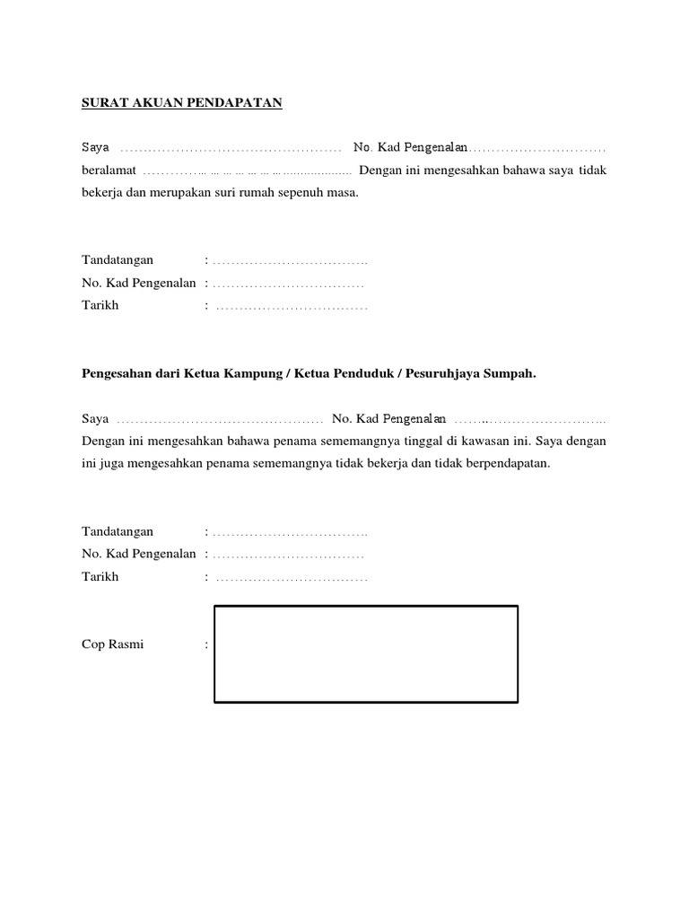 Contoh surat pengesahan jawatan format majikan 2 keterangan penghasilan atau gaji karyawan akuan pendapatan tawaran kerja 1. Surat akuan pengesahan pendapatan bekerja sendiri d47eyp65mjn2. More Documents from Dayalan Dina Surat Akuan Pengesahan Pendapatan Bekerja Sendiri October 2019 3999.